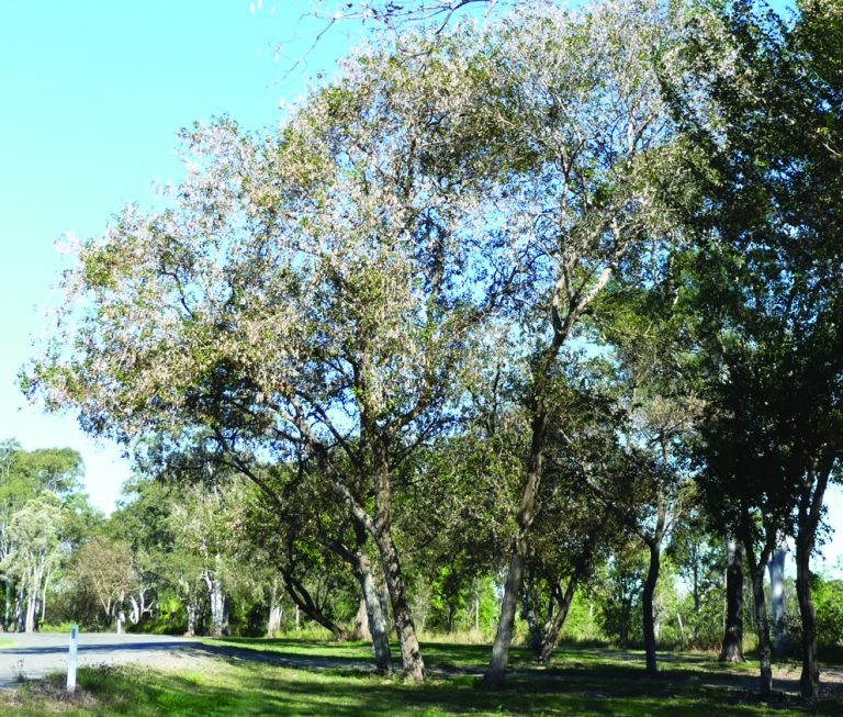 Small, semi-deciduous tree 4-8m occasionally to 12m in this region. Grey deeply furrowed bark on …